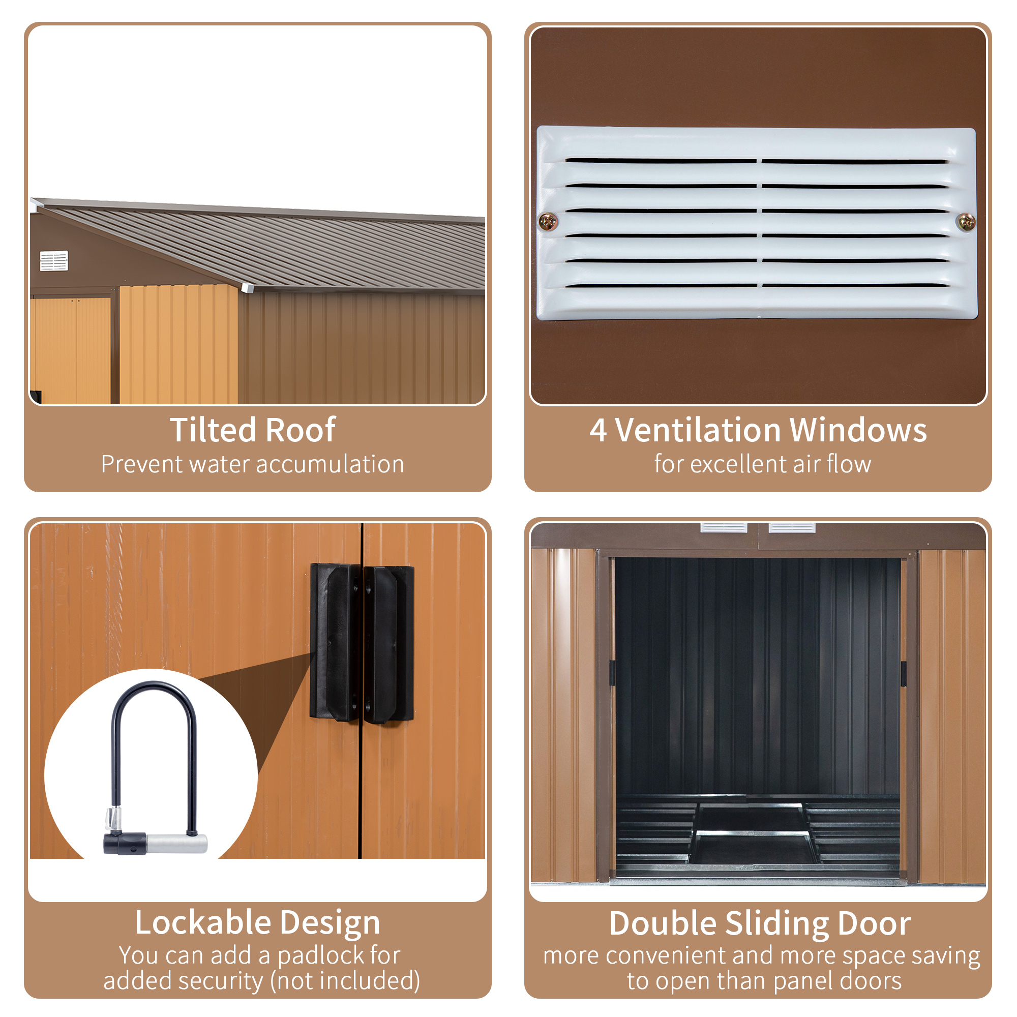 Serve as a tool shed, a bike shed, a mobility scooter shed, or a garden bin storage Spacious enough for storing all your outdoor tools, equipment and gardening gear in this galvanised shed Made from colour steel with a top coat for durability and protection against the elements Sliding double doors for easy access this metal storage shed Sloping roof for water to roll to floor, helping to prevent rust build-up Four ventilation to air to pass through this bike storage metal shed Floor foundation included, with all parts pre-cut and pre-drilled please use gloves when installing Assembly required