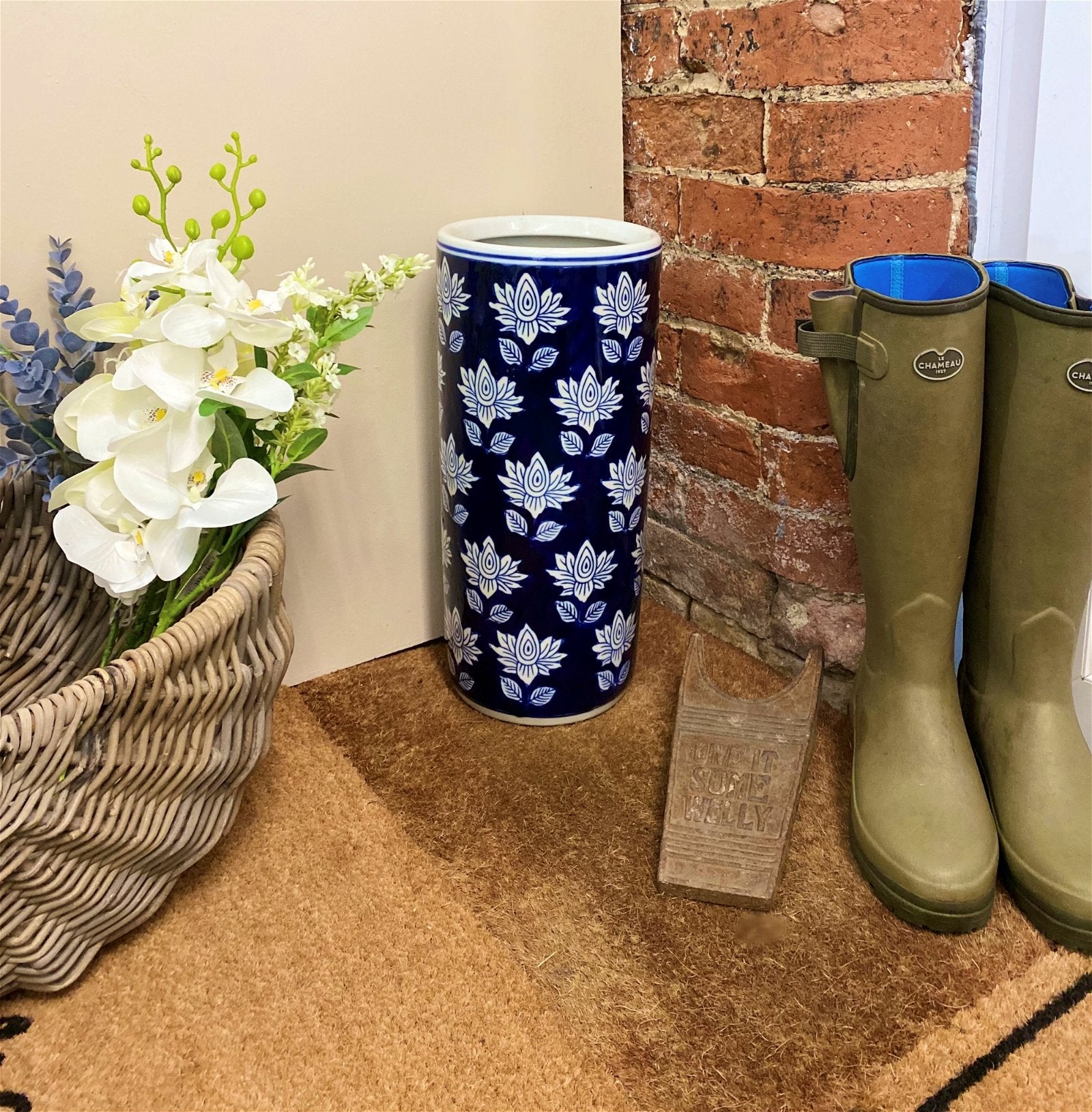 Blue with white flower ceramic umbrella stand, with a gloss finish. Perfect for keeping your hallway tidy. The internal diameter is 15cm and will hold several umbrellas. Measurements: D20 x H44 x W20cm