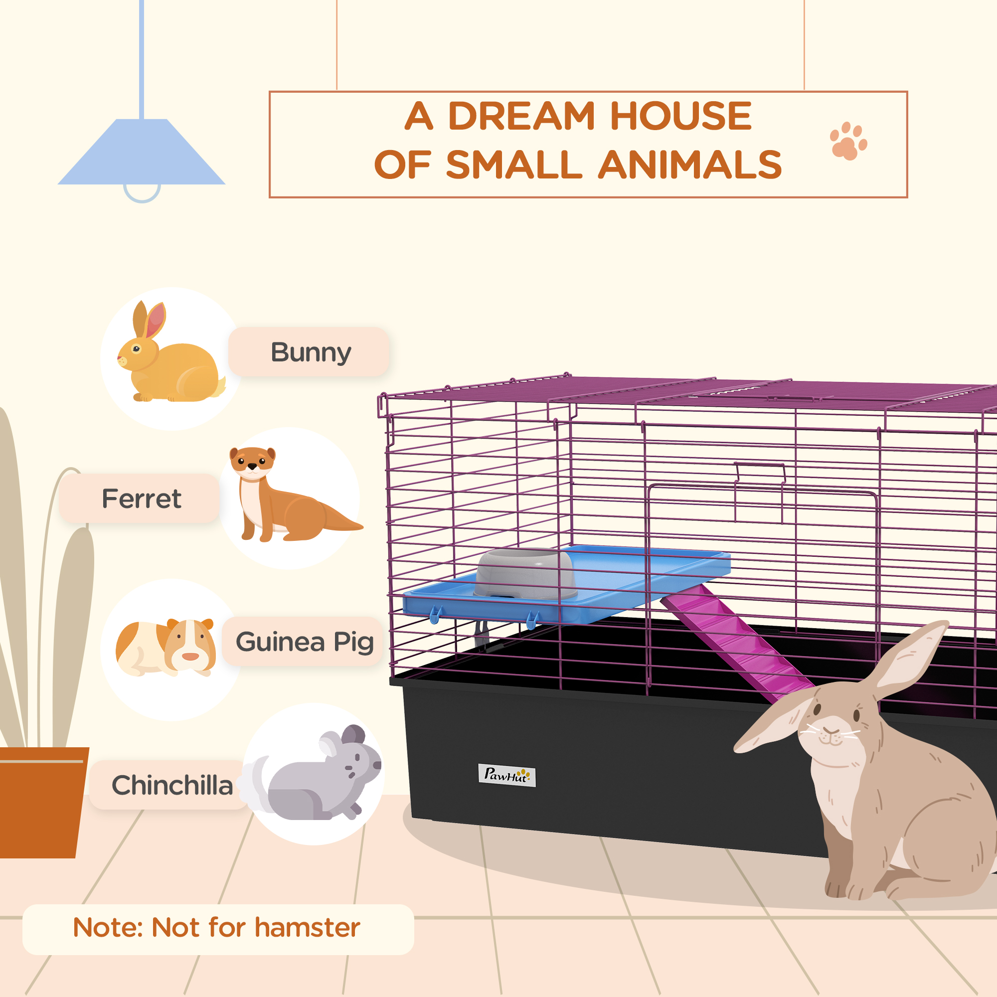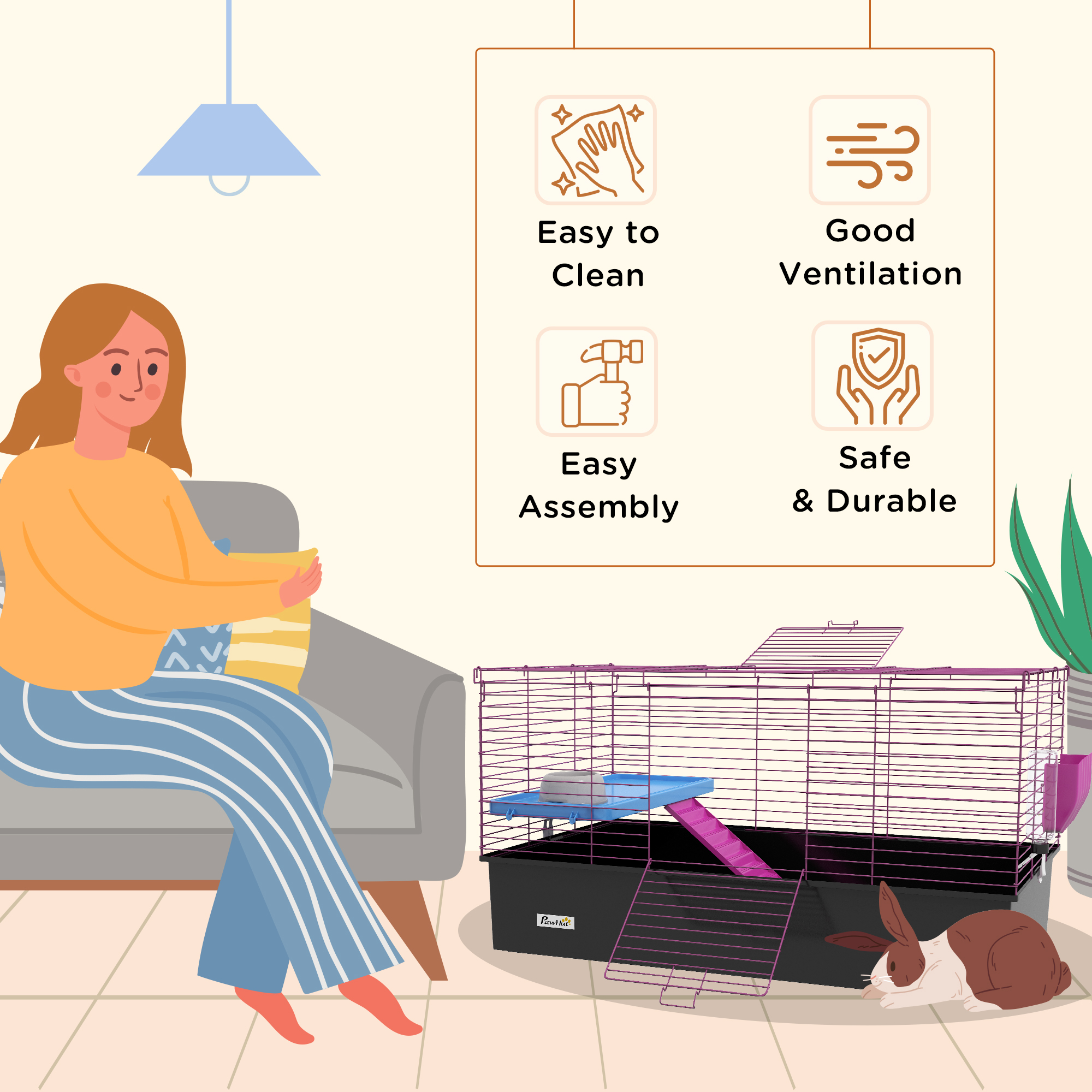 Watch pets thrive in this PawHut cage – a wonderful home for small animals. A colourful safe haven, it’s made with a cosy living area, protected by metal wire caging, keeping them safely inside and allowing air to flow through. Inside features a small platform with a food bowl, a water bottle, a ramp and a hay feeder, providing everything they need. Plus, there’s a deep base, which collects dirt and debris, keeping their space clean and comfortable. Give your pets the home they truly deserve.